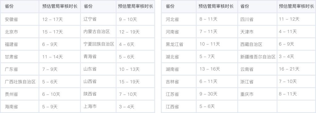 各個省管局預(yù)計審核時長,實(shí)際審核時長會根據(jù)備案場景有所不同,下表格僅供參考。詳情可查看 詳細(xì)規(guī)則。